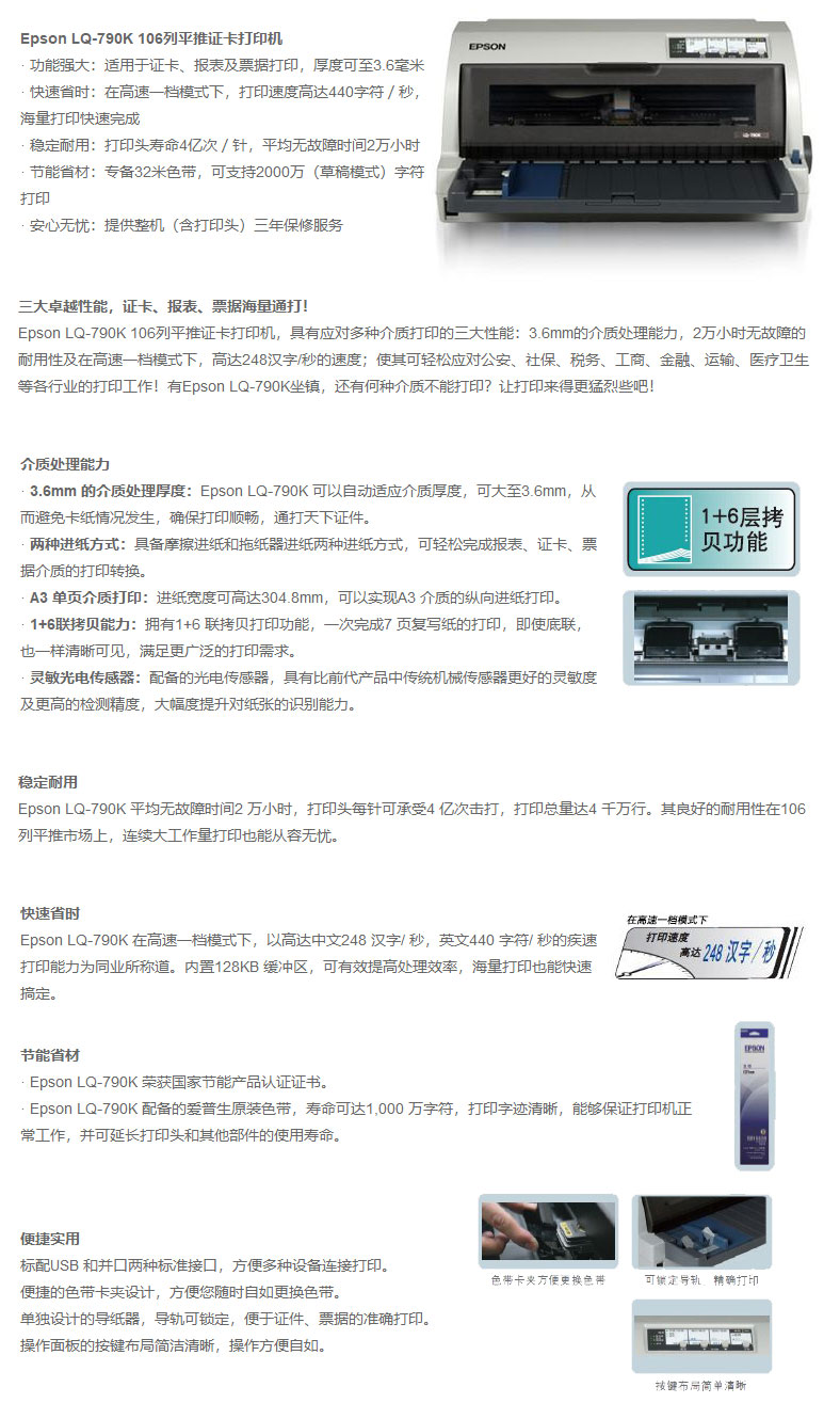 中文(7.5cpi) 247汉字/秒 英文(10cpi) 440字符/秒打印针寿命: