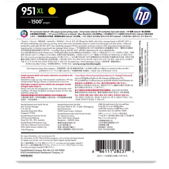 惠普(Hp)CN048AA 951XL 黄色墨盒 大容量 适用于设备8600;8610;8620;8600Plus;251dw;8100;276dw; 约1500页